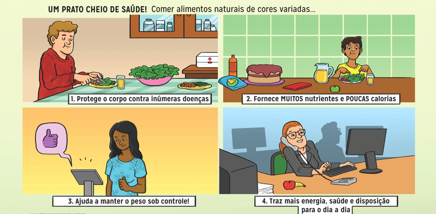 O material ensina que “alimentar-se bem” significa aproveitar ao máximo os nutrientes naturais presentes nos alimentos. Muitos deles possuem propriedades que evitam doenças e ajudam a manter o peso sob controle.